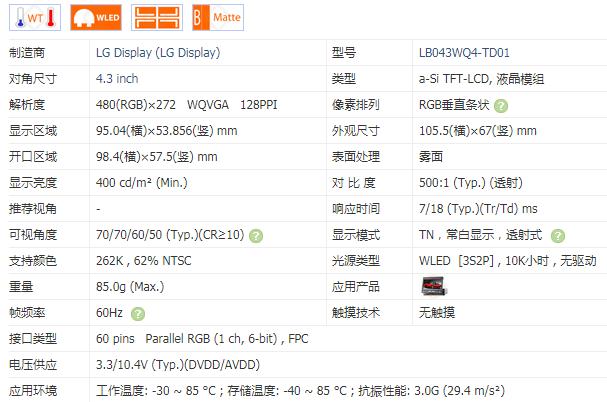 產(chǎn)品名稱:現(xiàn)貨全新原裝 4.3寸 LB043WQ4-TD01 液晶顯示屏